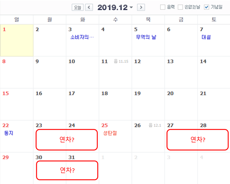11¿ù¿¡µµ °øÈÞÀÏÀÌ ¾ø´Ù¤Ð¤Ð ¾Æ½±´Ù¤Ð¤Ð 12¿ùÀº 25ÀÏÀÌ Å©¸®½º¸¶½ºÀε¥ ³²Àº ¿¬Â÷°¡ ÀÖ´Ù¸é 23, 24ÀÏÀ̳ª 26, 27ÀÏ¿¡ ¾²¼Å¼ ÇÑ ÇØ¸¦ ½Å³ª°Ô ¸¶¹«¸®ÇϽô °Ç ¾î¶³±î¿ä?